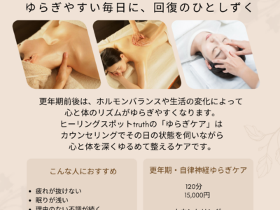 ヒーリングスポットtruthのゆらぎケアでは、丁寧なカウンセリングを行い、その日の状態に合わせてオイルトリートメント・ヘッドケア・レイキヒーリングを組み合わせ、心と体を深くゆるめて整えていきます。